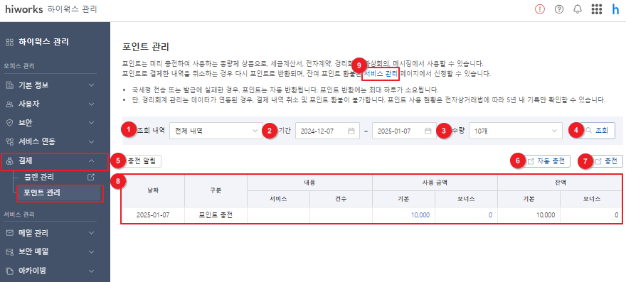 ⑨ 잔여 포인트의 환불을 원할 경우 [서비스 관리]를 클릭하여 환불 신청합니다. 자세한 매뉴얼은 [하이웍스(New) > 오피스 관리하기 > 결제 > 포인트 환불하기]를 참고하세요.