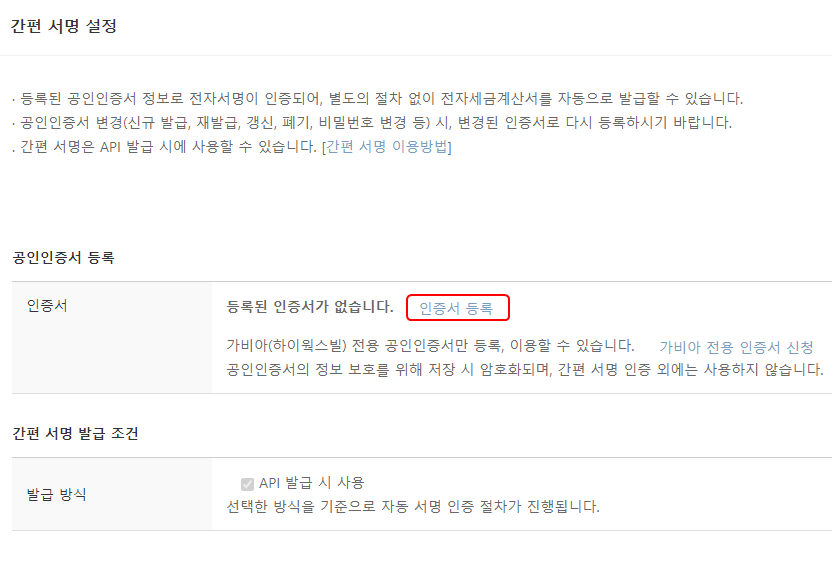 •세금계산서 관리자 권한이 있는 계정만 접근할 수 있습니다. 사용 권한 설정하기 • 전자 서명을 이용할 수 있는 공인인증서는 세금계산서용 가비아 전용 인증서 또는 특정 범용 인증서만 허용됩니다. OID: 1.2.410.200004.5.2.1.6.115 / 1.2.410.200005.1.1.6.8 / 1.2.410.200004.5.1.1.7 |