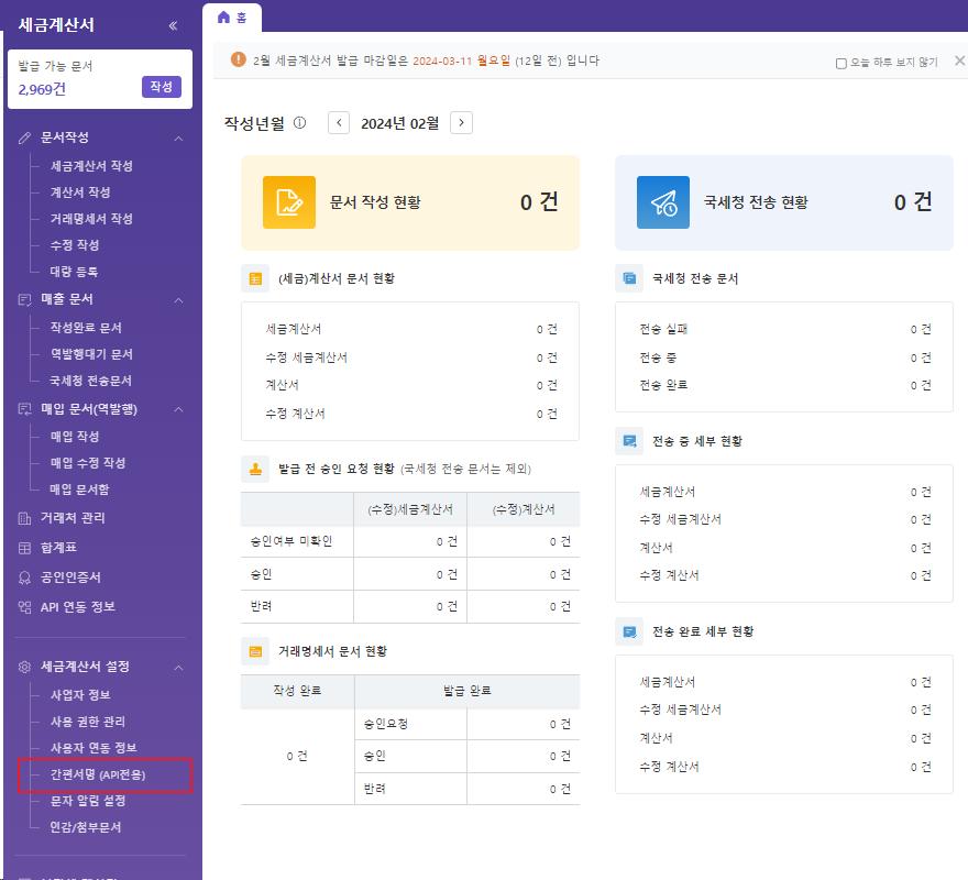 3. [세금계산서 >간편서명(API 전용)]을 클릭합니다.