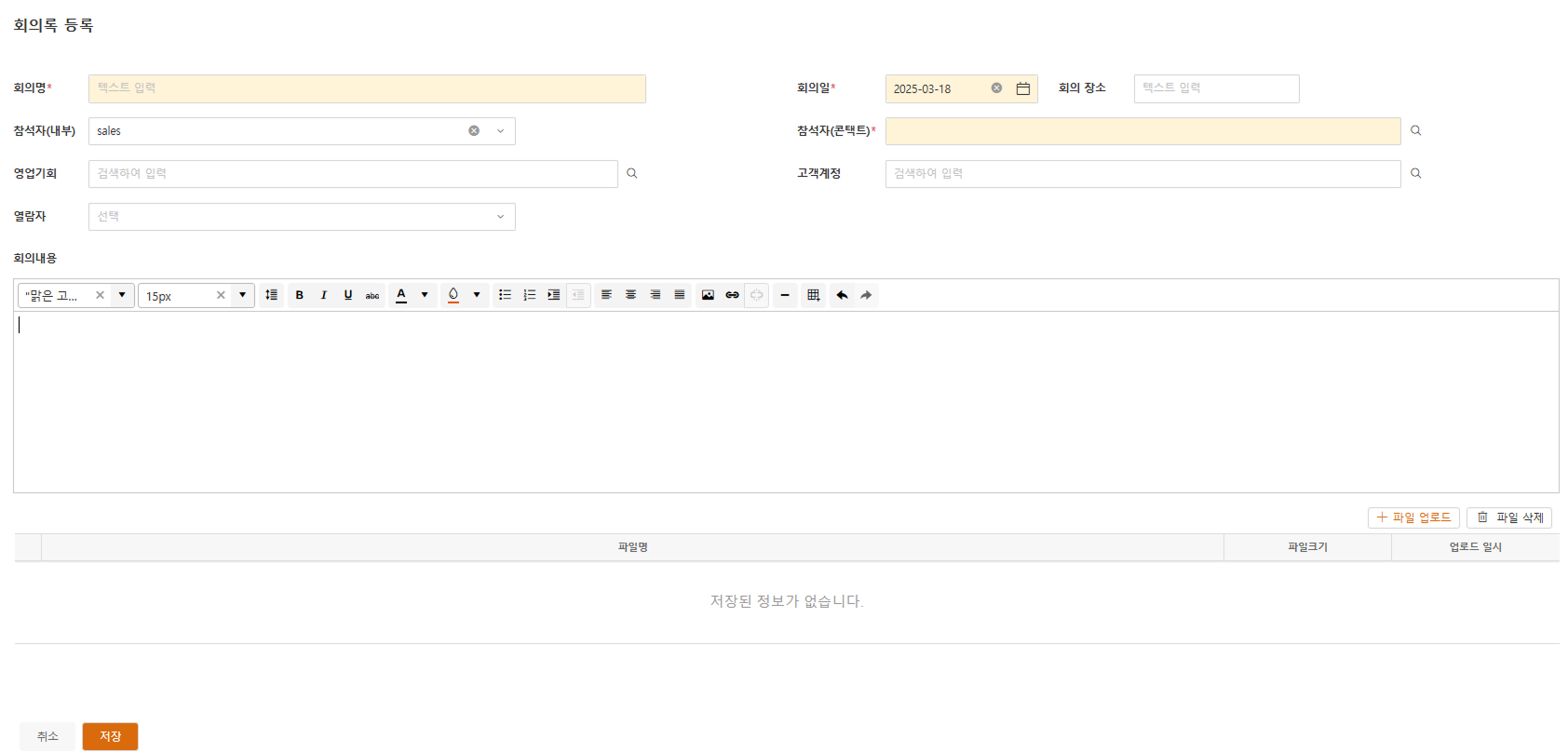 - 열람자 및 내부 참석자, 참석자(콘택트), 관련 영업기회 및 계정을 추가할 수 있습니다.