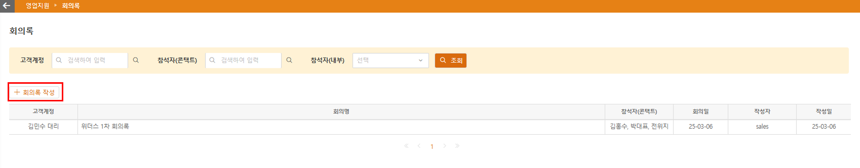 - 검색 필터와 입력된 데이터가 연동된 테이블에서 회의록을 확인할 수 있습니다.