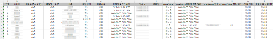 - 사용자의 POP3/SMTP 설정 현황과 최근 3개월 이내의 마지막 접속 일시/유형/국가/IP 정보, 메일 전용 비밀번호 사용 여부를 확인할 수 있습니다.