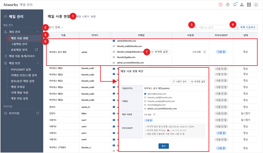 ⑤ 목록: 메일 사용자 정보를 확인하고 각 계정 별 부계정 설정을 할 수 있습니다.