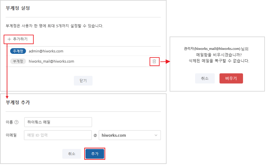 - 부계정 삭제 시 사용자의 부계정 메일함이 삭제되며, 해당 메일함에 있던 메일은 모두 받은 메일함으로 이동합니다.
