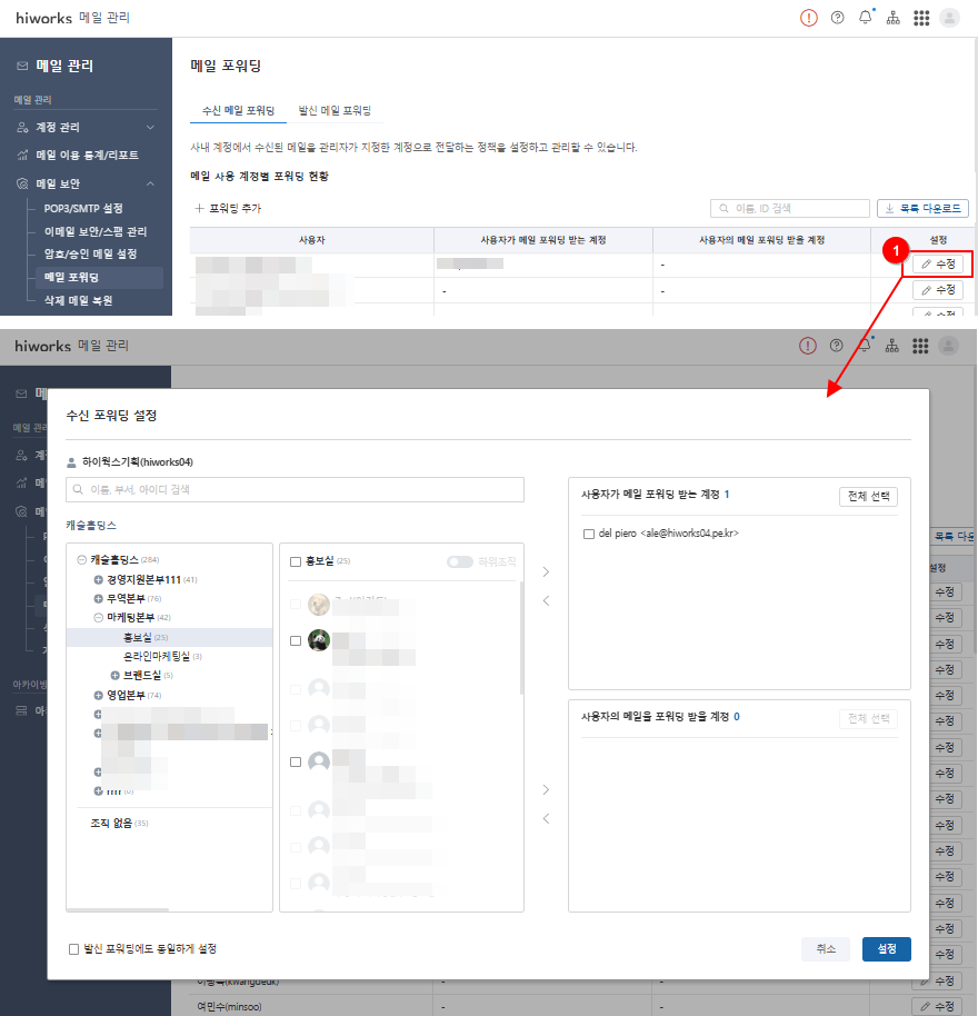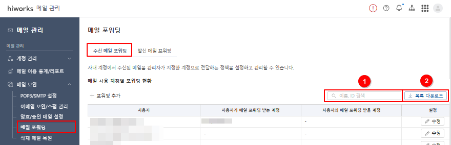 사내 정보 보안을 위해 특정 사용자가 받는 메일을 전체 관리자 또는 다른 사용자가 포워딩받을 수 있도록 기능을 제공합니다.
