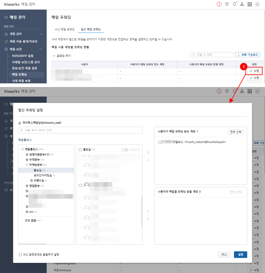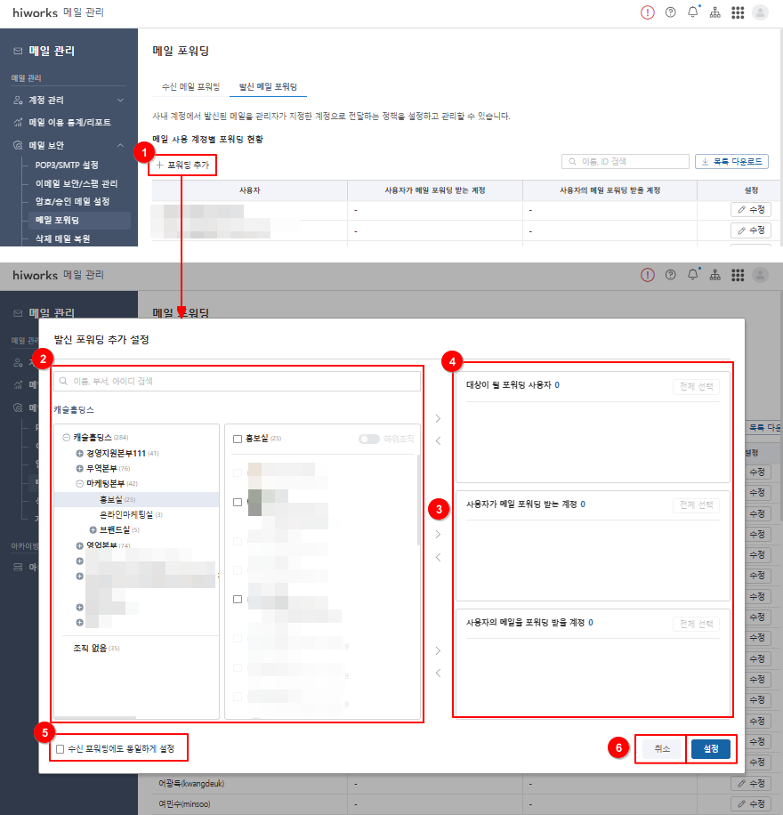 - 사용자가 메일 포워딩 받는 계정: 발송한 메일을 '대상이 될 포워딩 사용자'에게 제공하게될 사용자를 선택하여 추가합니다.