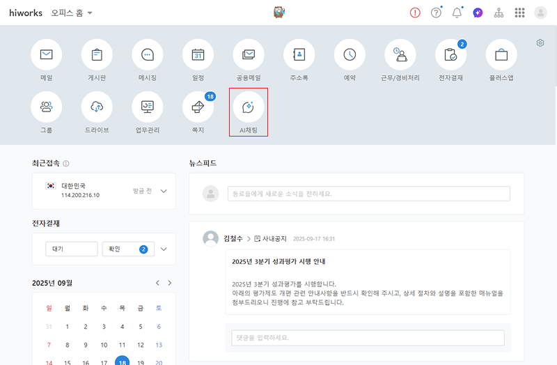 2. 로그인 후 오피스 홈에서 [AI채팅]을 클릭합니다.