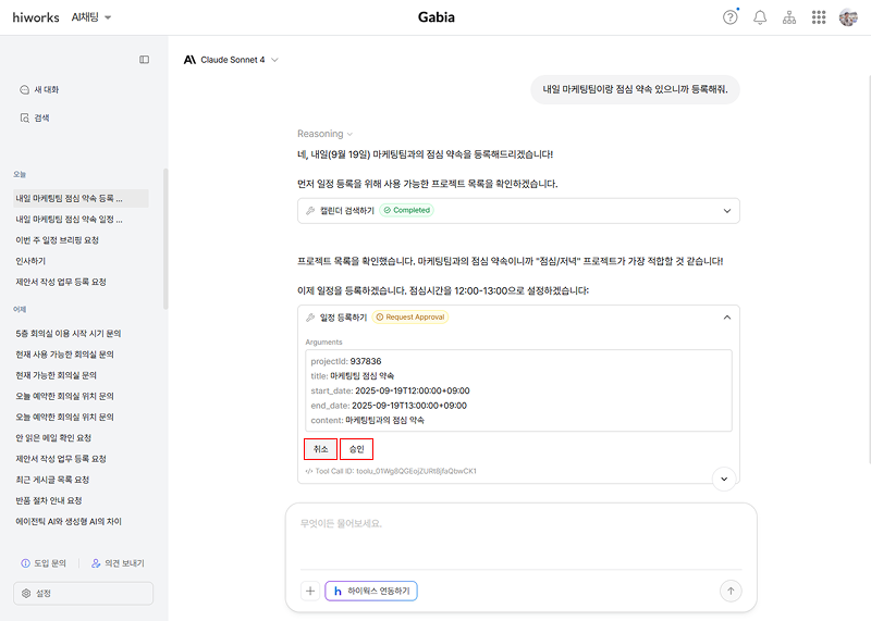 6. AI가 승인을 요청하는 경우, 확인 후 [승인] 혹은 [취소]를 클릭합니다.