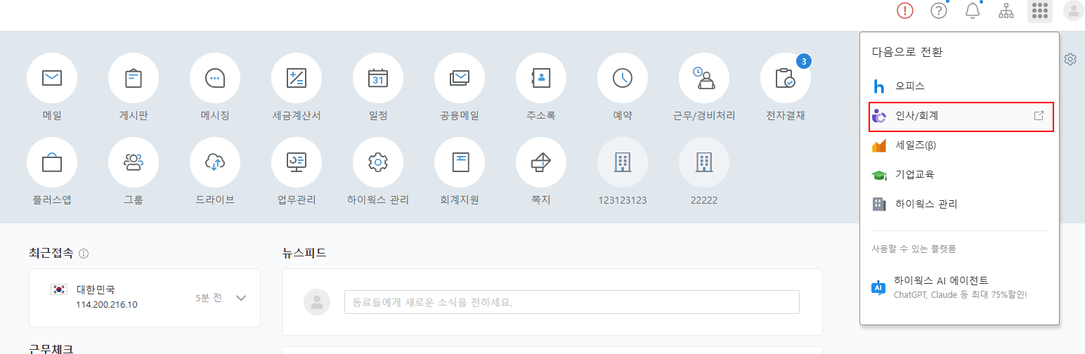 2. 기업교육의 사용 설정은 인사관리자가 할 수 있습니다. 로그인 후 우측 상단 플랫폼 메뉴에서 [인사/회계]를 클릭합니다.