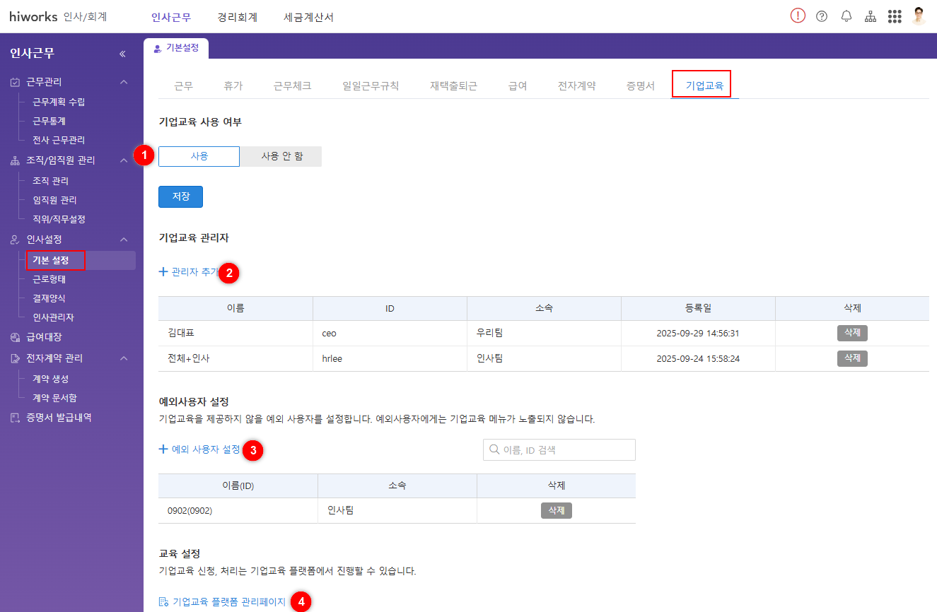 3. [인사/회계>인사근무>기본설정>기업교육]에서 기업교육을 사용으로 설정할 수 있습니다.