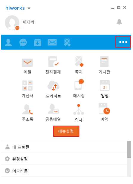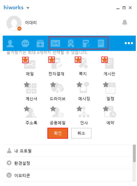 • 즐겨찾기 메뉴는 최대 4개까지 선택할 수 있습니다. • PC 메신저의 메뉴 설정은 모바일 메신저와 동기화되지 않습니다. • 전체 관리자(슈퍼 관리자)에 의해 설정된 서비스 사용 설정은 전용 오피스 PC 버전에만 적용되며, 메신저 상 메뉴에는 노출될 수 있습니다. |