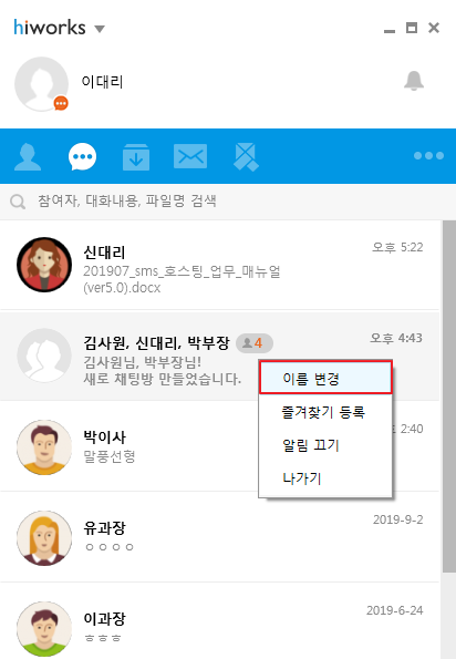 2. 채팅방 목록에서 원하는 채팅방을 마우스 우클릭 후 [이름 변경]을 클릭합니다.