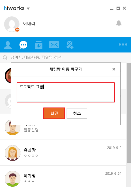 3. 채팅방 이름을 100자 이내로 입력 후 [확인]을 클릭합니다.