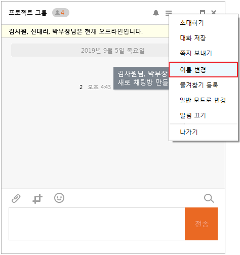 4. 채팅방 내에서도 우측 상단 [ > 이름 변경]을 클릭해 변경할 수 있습니다.