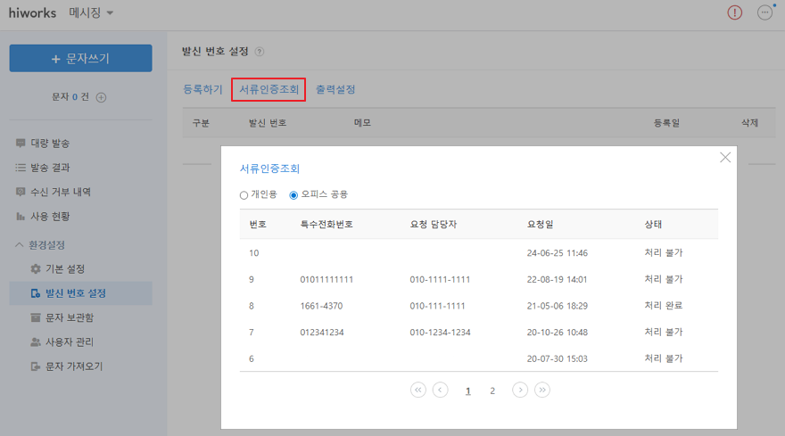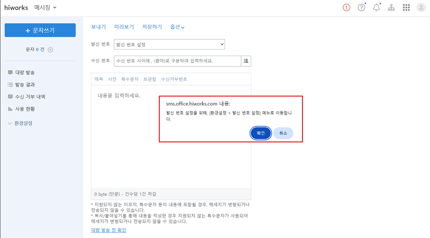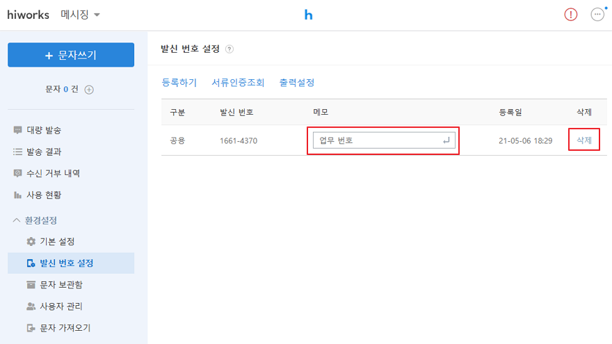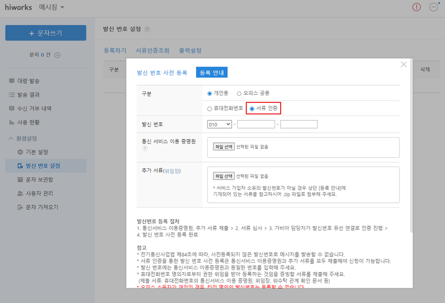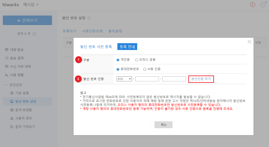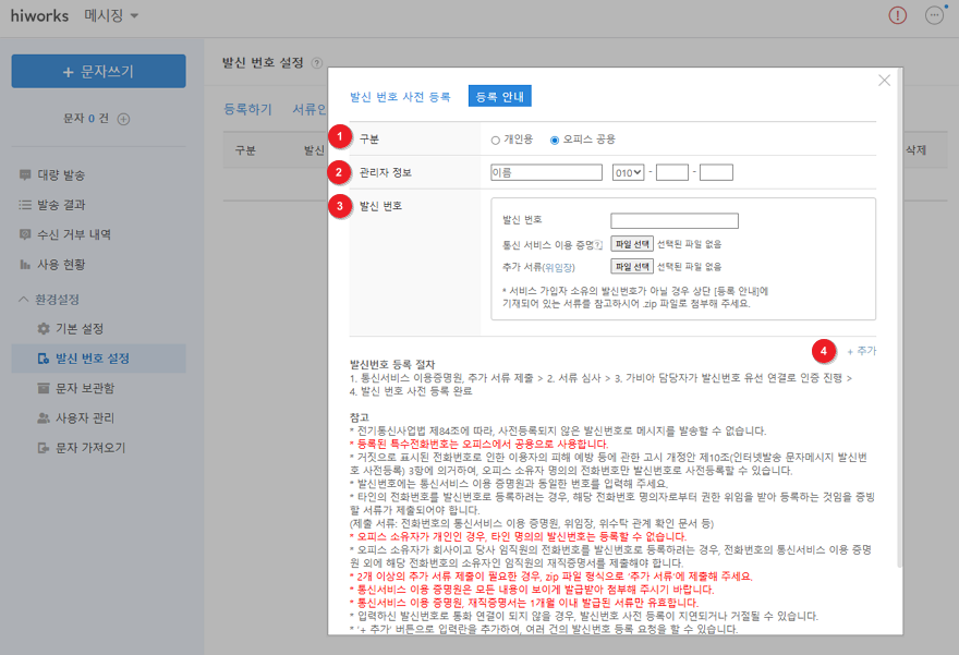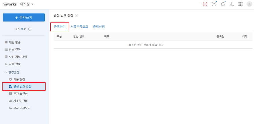 하이웍스 메시징 사용을 위해선 먼저 발신 번호 등록 절차를 진행해주셔야 합니다.