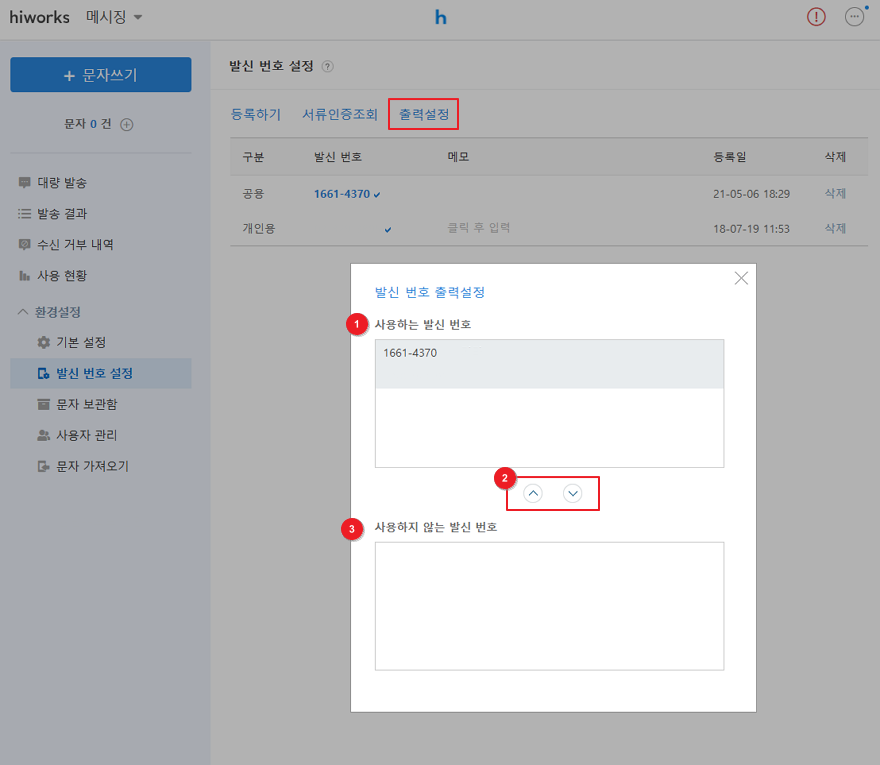 ① 현재 사용 중인 발신 번호 리스트입니다. 해당 리스트 중 사용하지 않을 번호는 선택해 이동할 수 있습니다.