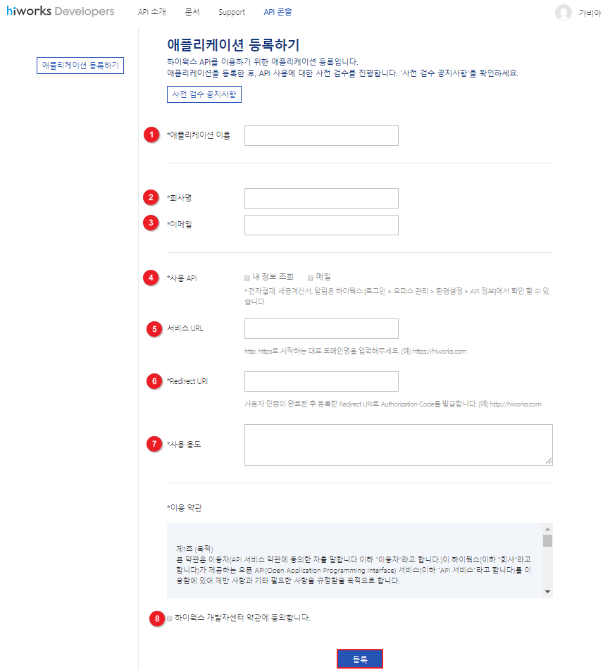 1. 하이웍스 개발자센터 홈페이지 로그인 후 상단 [ API 콘솔 > 애플리케이션 등록하기]를 클릭합니다.