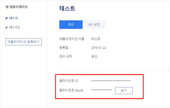4. 승인이 완료되면 클라이언트 ID와 클라이언트 Secret이 발급됩니다.