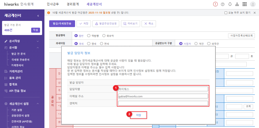 ② 저장: 작성한 세금계산서를 저장합니다.