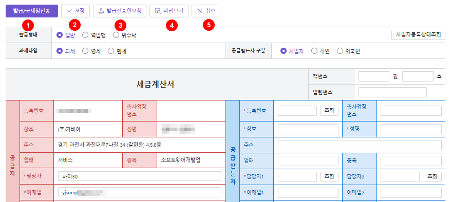 ① 발급/국세청전송 : 작성한 세금계산서를 발급/국세청 전송하며 공급받는 자에게 이메일이 발송됩니다.