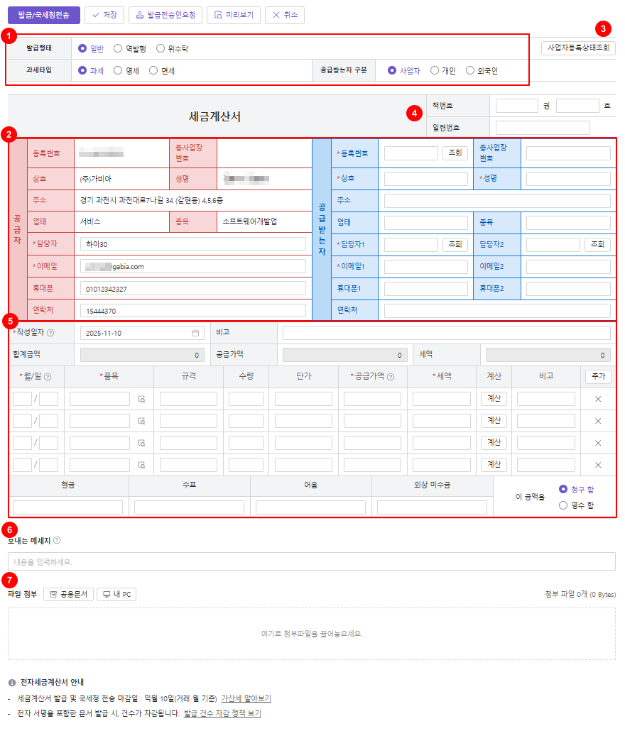 ⑥ 보내는 메세지 : 거래 관련 메모를 입력할 수 있습니다. 발급 시 작성한 메세지는 수신 담당자에게 전달되며, 발급 시점 이후로 수정 불가합니다.