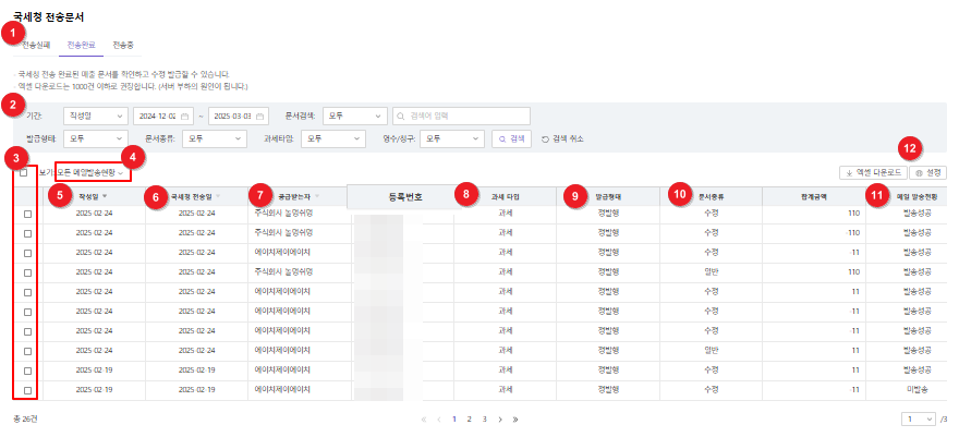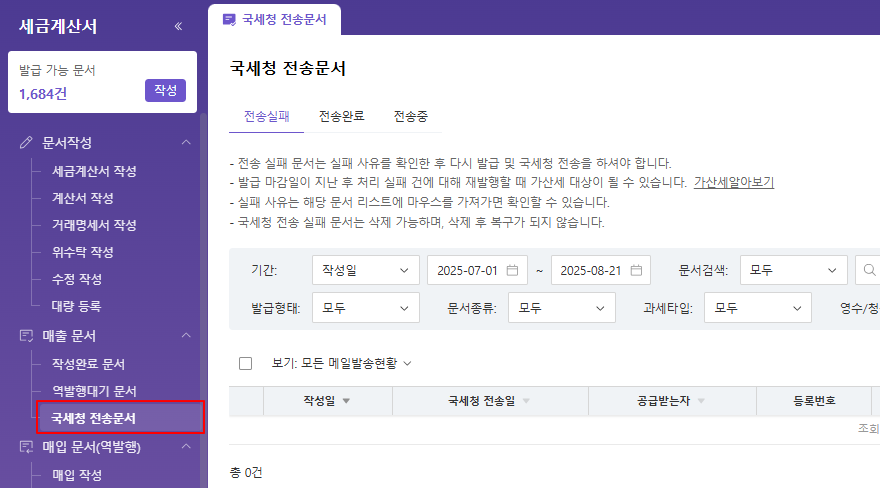 [국세청 전송문서] 메뉴에서는 국세청에 전송이 완료된 문서, 전송 중인 문서, 전송이 실패한 문서를 조회할 수 있습니다.