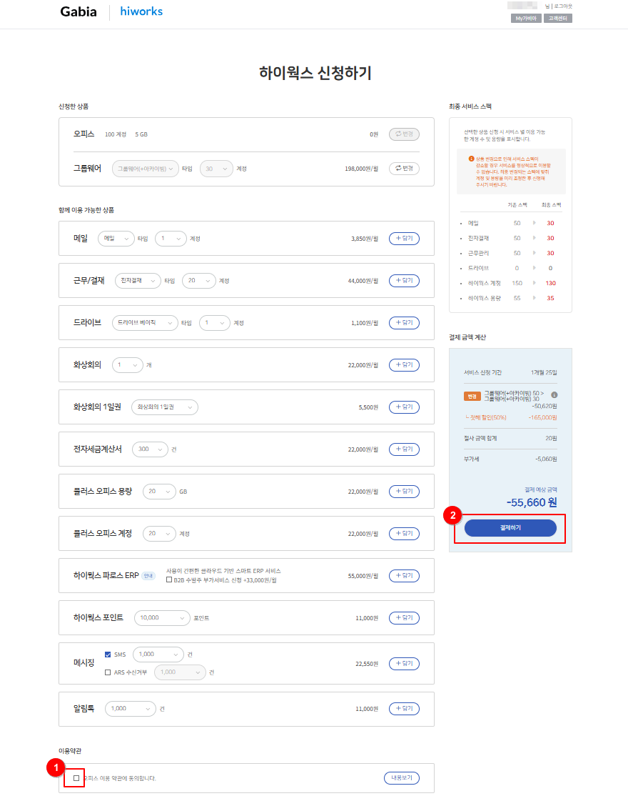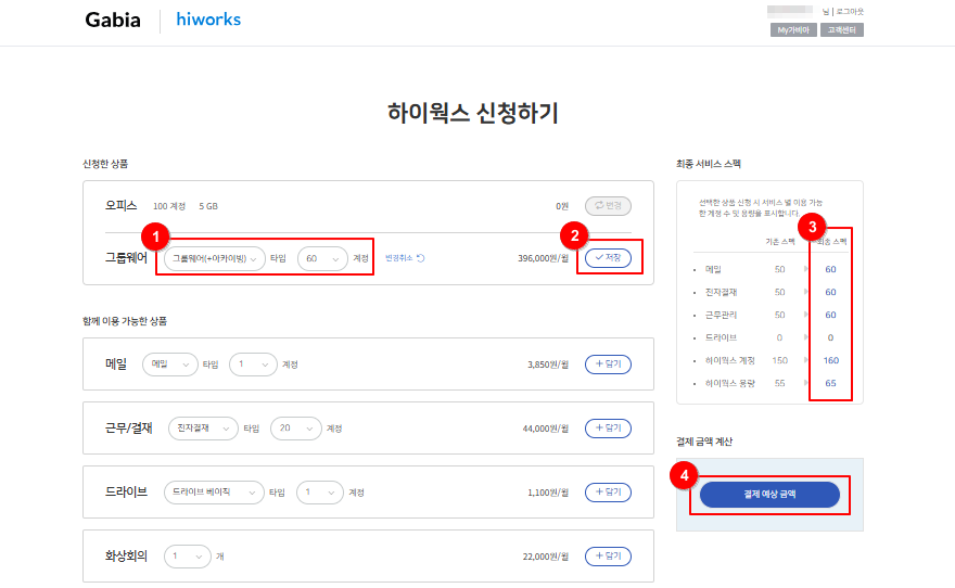 8-1. 현재 상품에 계정을 추가하는 경우 (예. 그룹웨어(+아카이빙) 50계정 -> 그룹웨어(+아카이빙) 60계정)