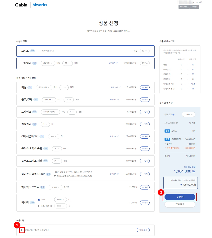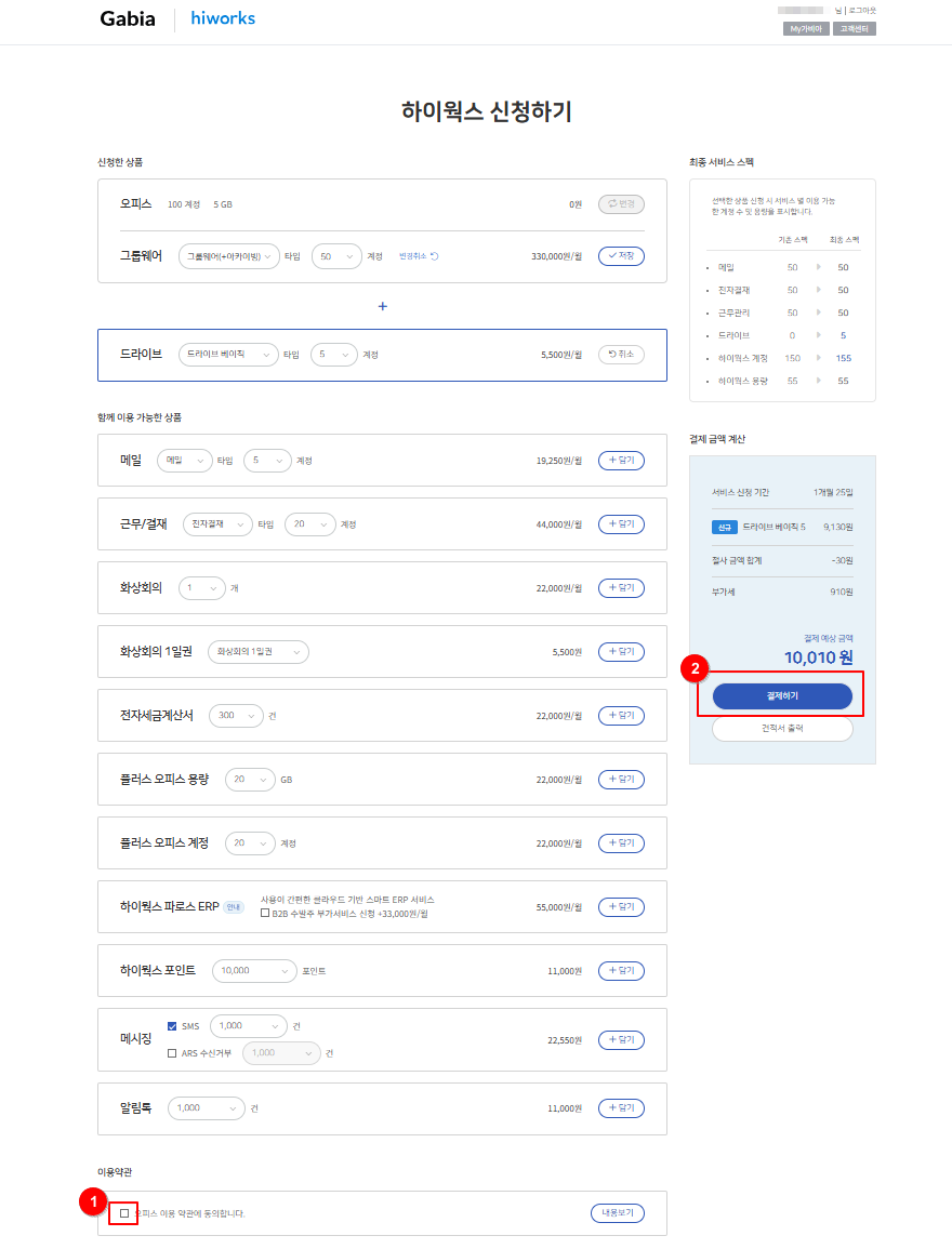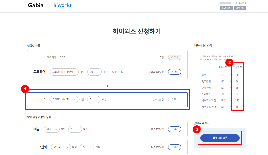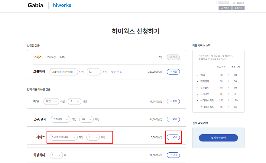 8-3. 새로운 상품을 추가로 신청하는 경우 (예. 그룹웨어(+아카이빙) 50 계정-> 드라이브 베이직 5 계정 추가)