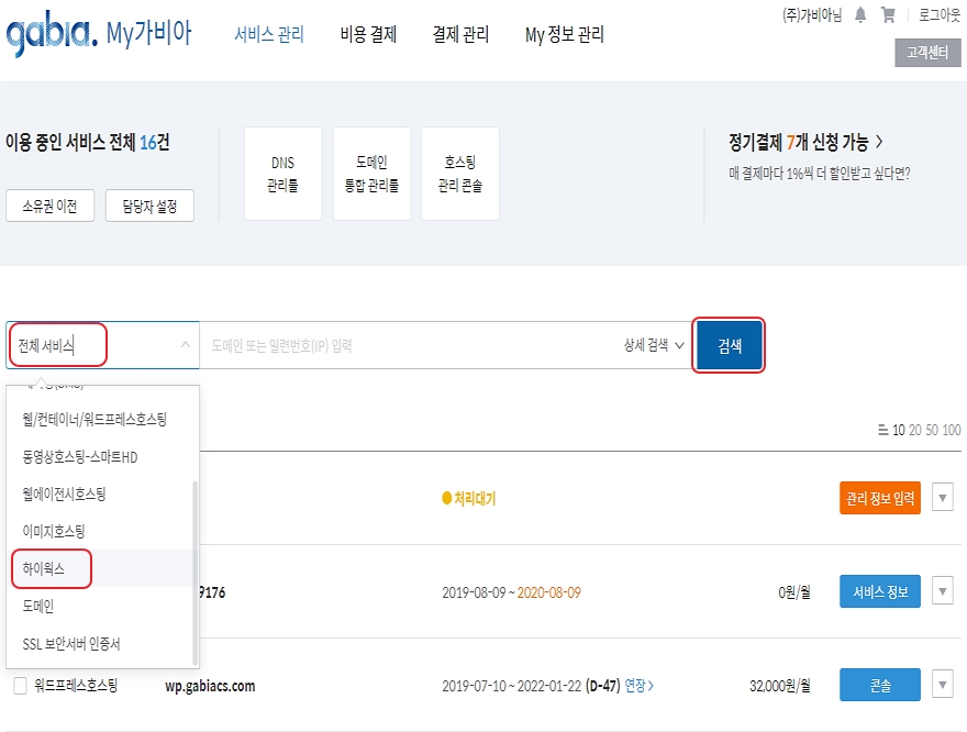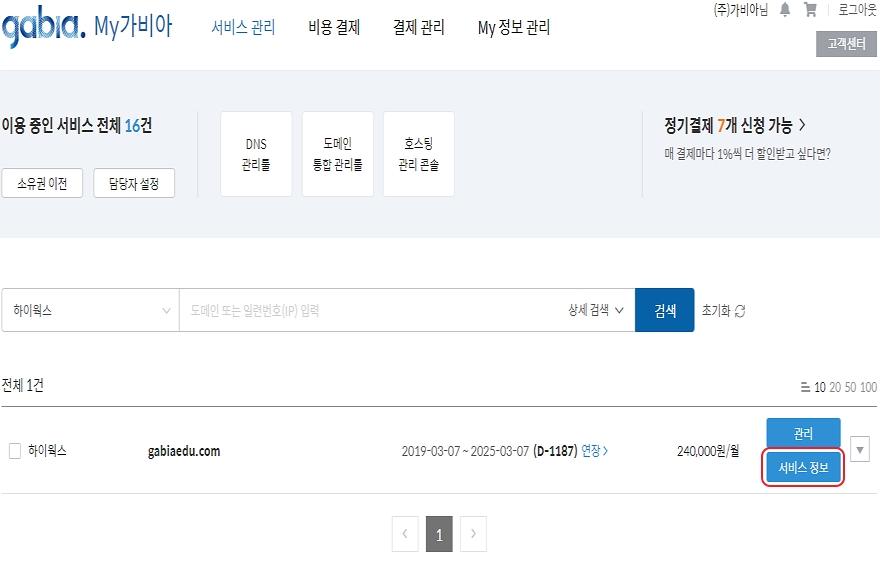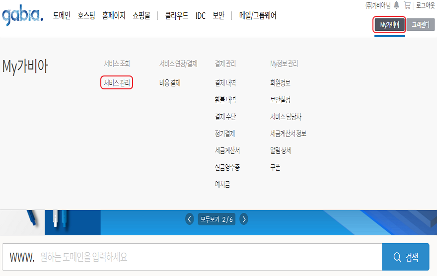 2. 로그인 후 가비아 홈페이지 오른쪽 상단 [My가비아]에 마우스를 올린 후 [서비스 관리]를 클릭합니다.