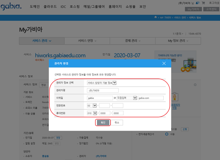 소유자 정보 이외 관리자 정보를 추가로 등록해 하이웍스 서비스 기간 만료 안내 및 결제 알림을 설정할 수 있습니다.