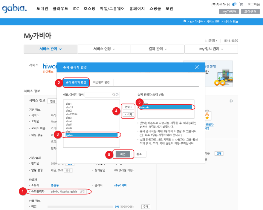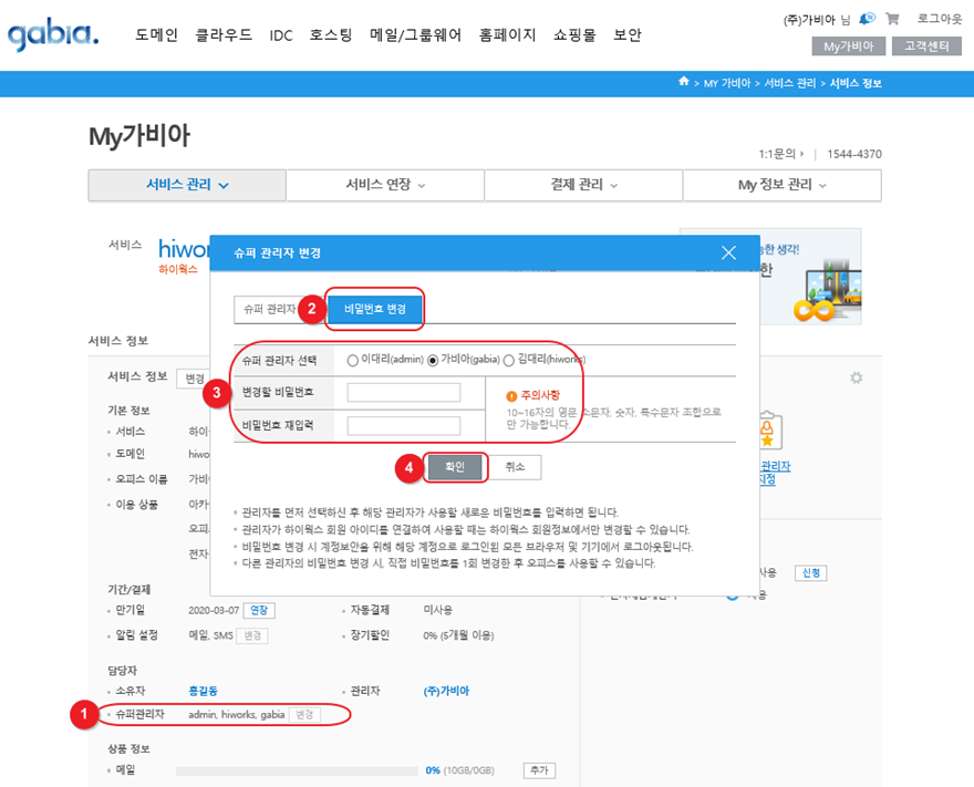 가비아 홈페이지와 하이웍스 오피스 내에서 슈퍼 관리자(전체 관리자)를 변경할 수 있으며, 둘 중 한 곳만 변경해도 같이 변경됩니다.