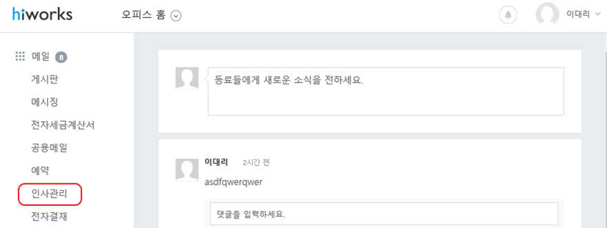 2. 로그인 후 오피스 홈에서 [인사관리]를 클릭합니다.