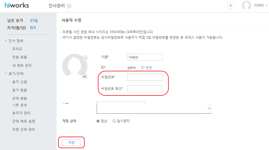 (3) 하이웍스 오피스에 로그인 후 [인사관리 > 인사관리 > 사용자 관리]에서 사용자 목록의 [변경한 계정 아이디]를 클릭해, 계정 구분 항목에 [전체 관리자] 또는 [일반 사용자]로 설정되었는지 확인합니다.