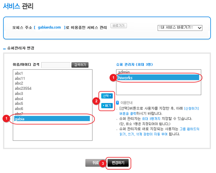 가비아 홈페이지에서 하이웍스 서비스를 가입한 경우 [메일 > 서비스 관리하기 > gabia.com 구매 고객 > 슈퍼 관리자 변경]을 확인 바랍니다.