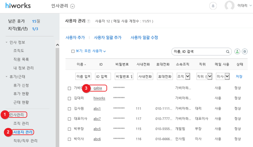 3. [인사관리 > 사용자 관리]로 이동해 변경할 [계정 아이디]를 클릭합니다.