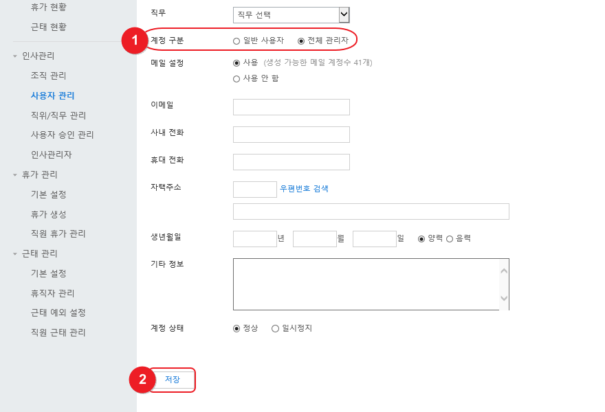 계정 구분에서 [일반 사용자] 또는 [전체 관리자]를 선택해 슈퍼 관리자로 해제 또는 지정이 가능합니다.