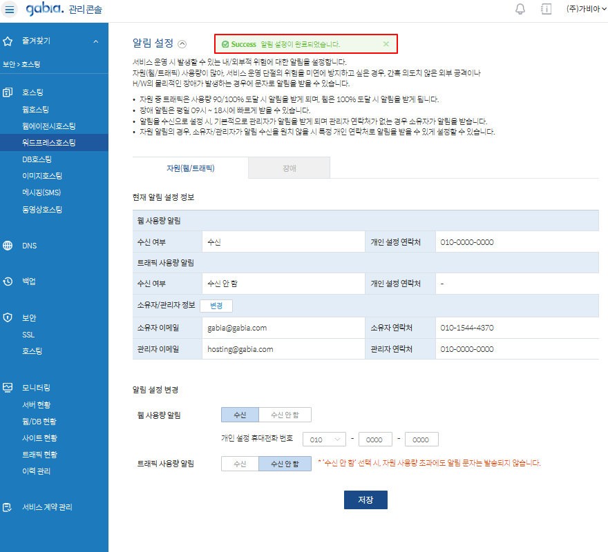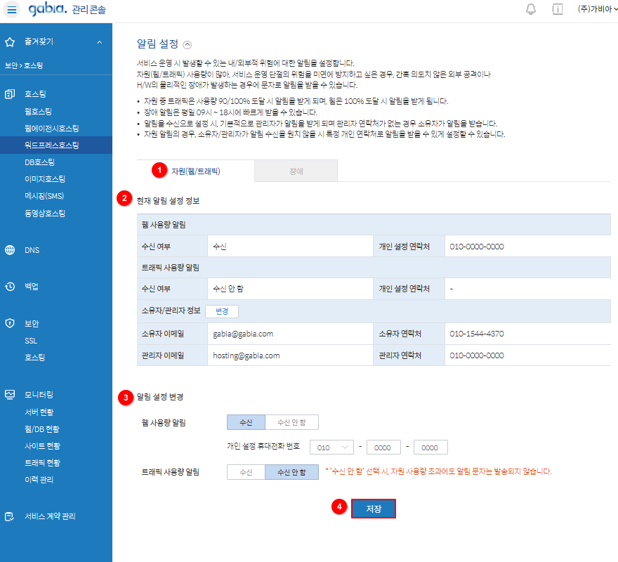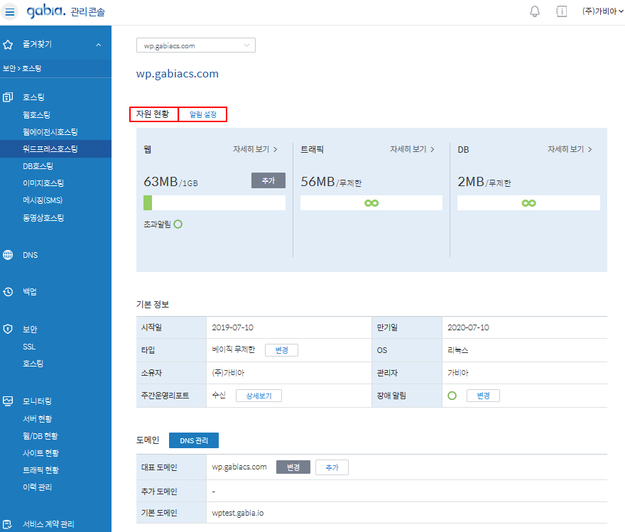 • 가비아에서 제공되는 워드프레스호스팅의 트래픽 용량은 무제한입니다. • 웹은 월 약정 웹 용량의 100% 도달 시 알림을 수신합니다. • 자원 알림은 특정 개인 연락처로 알림을 받을 수 있게 설정할 수 있습니다. |