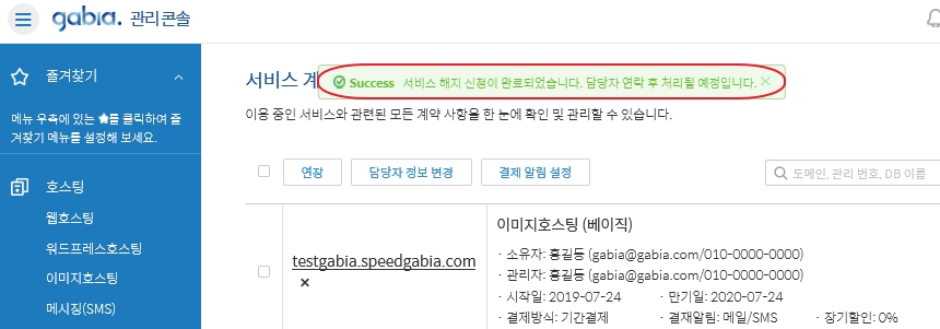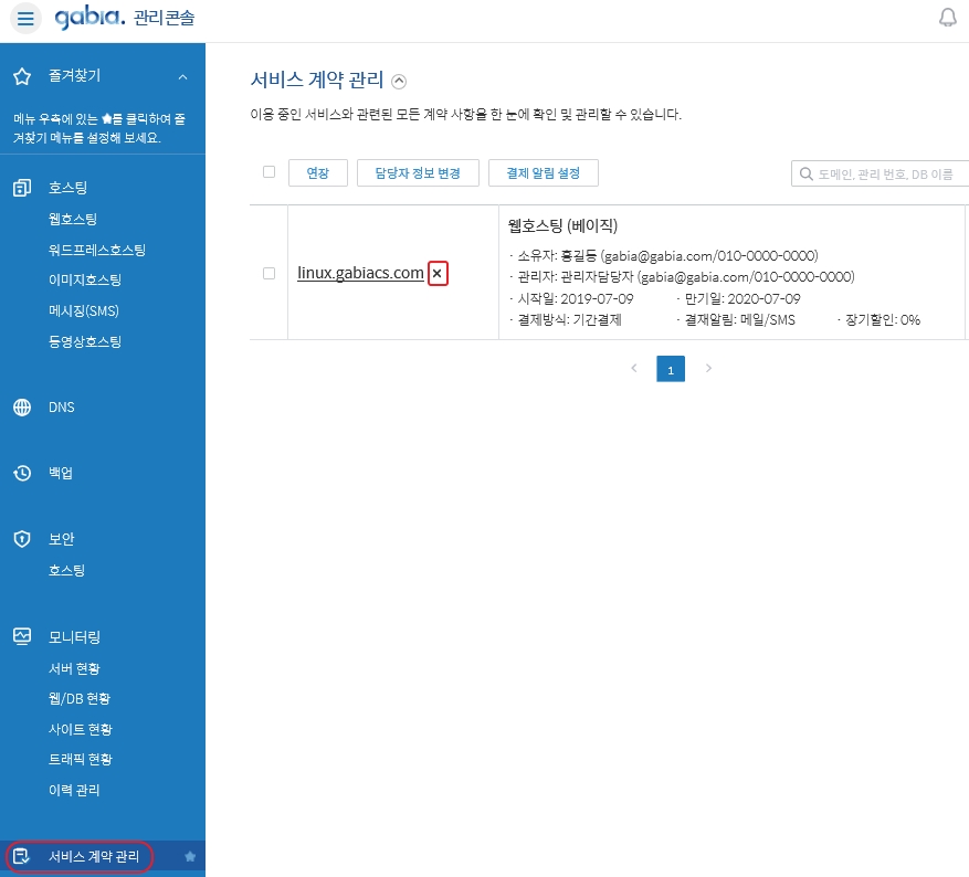 4. [호스팅 관리 콘솔 > 서비스 계약관리]에서 해당 호스팅 도메인 오른쪽의 [X]를 클릭합니다.