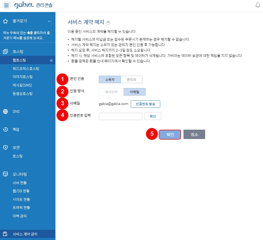 • 서비스 계약 해지는 소유자 또는 관리자 본인 인증 후 가능합니다. • 해지할 서비스에 미납금 또는 접수된 주문서가 존재하는 경우 서비스 해지 신청이 불가합니다. • 서비스 해지 전에 필요한 데이터는 미리 백업해두시기 바랍니다. |