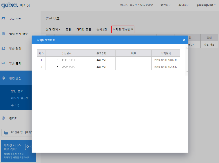 6. [환경 설정 > 발신 번호 > 삭제된 발신 번호]를 클릭해 등록한 발신 번호 중 삭제된 발신 번호와 삭제 일시를 확인할 수 있습니다.