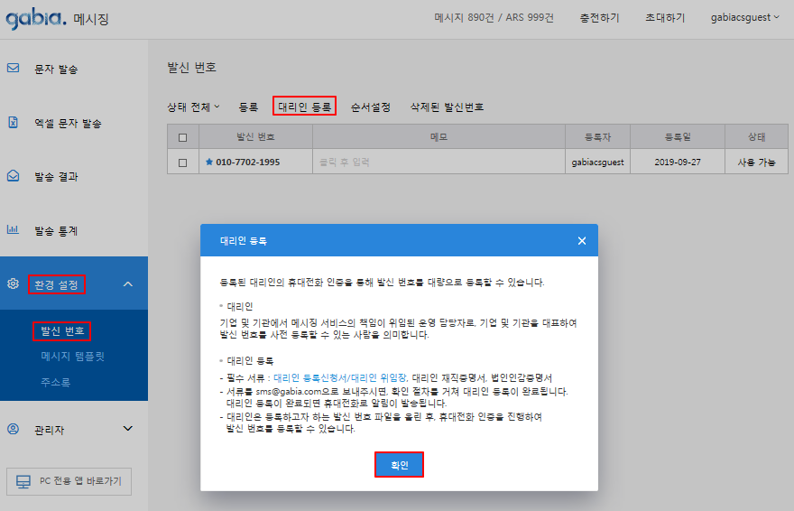 발신 번호 대량 등록을 위해서는 대리인이 등록되어 있어야 합니다.