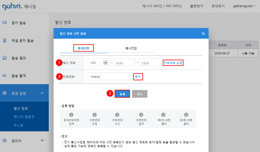 ① 발신 번호로 사용할 휴대전화 번호를 입력하고 [인증번호 요청]을 클릭합니다.