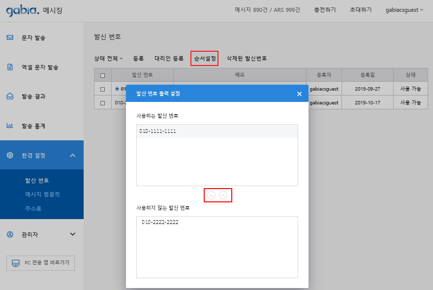 5. [환경 설정 > 발신 번호 > 순서설정]을 클릭해 발신 번호 순서를 설정할 수 있습니다.