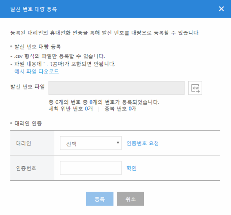 대리인 등록이 완료되면, 파일 첨부를 통해 발신 번호 대량 등록이 가능합니다. 단, 등록된 대리인의 인증 후 등록이 가능합니다.