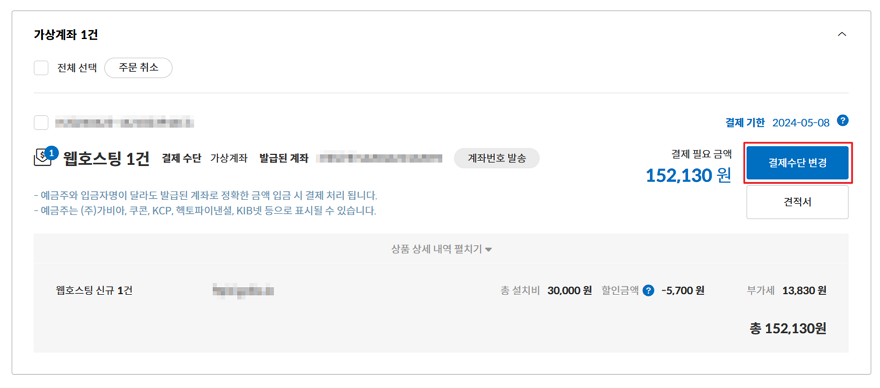 • 결제 방식을 변경하는 경우, 발급된 가상계좌 정보는 취소되며 쿠폰 및 예치금은 결제 페이지에서 다시 설정해야 합니다. |