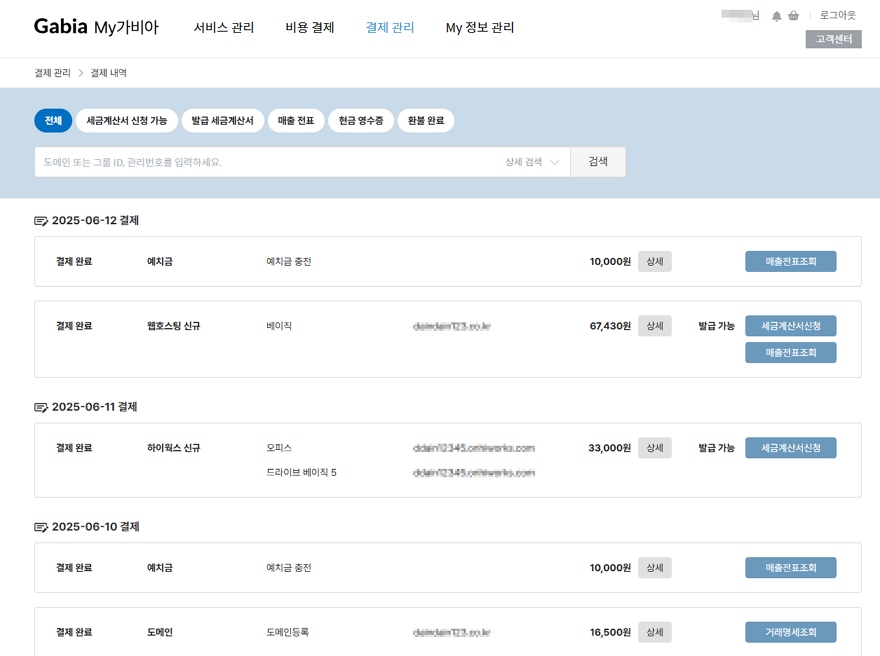 가비아 홈페이지에서 서비스 구매를 위해 결제한 내역을 확인하는 방법은 다음과 같습니다.
