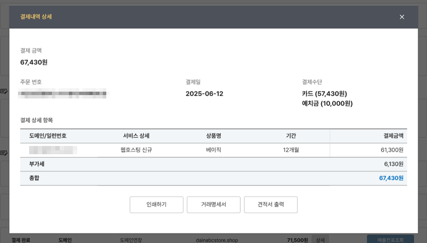 5. 결제 금액의 우측 [상세]를 클릭하면 세부 결제 내역, 거래명세서, 견적서를 확인 및 출력할 수 있습니다.