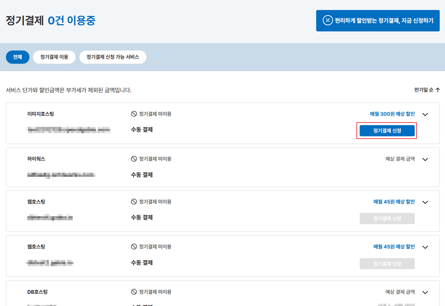 3. 목록에서 정기결제 신청할 서비스를 확인한 후, 정기결제 신청을 클릭합니다.