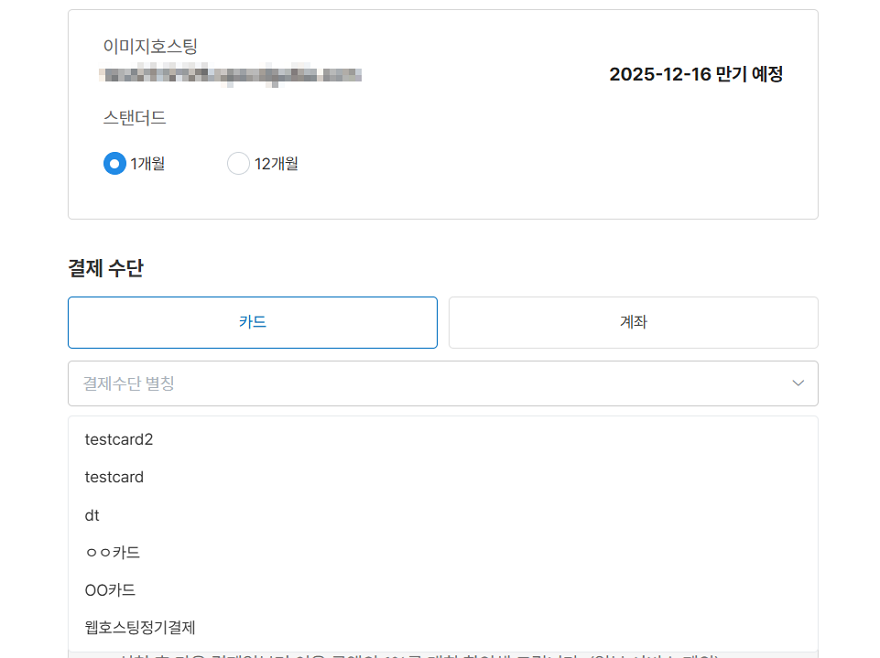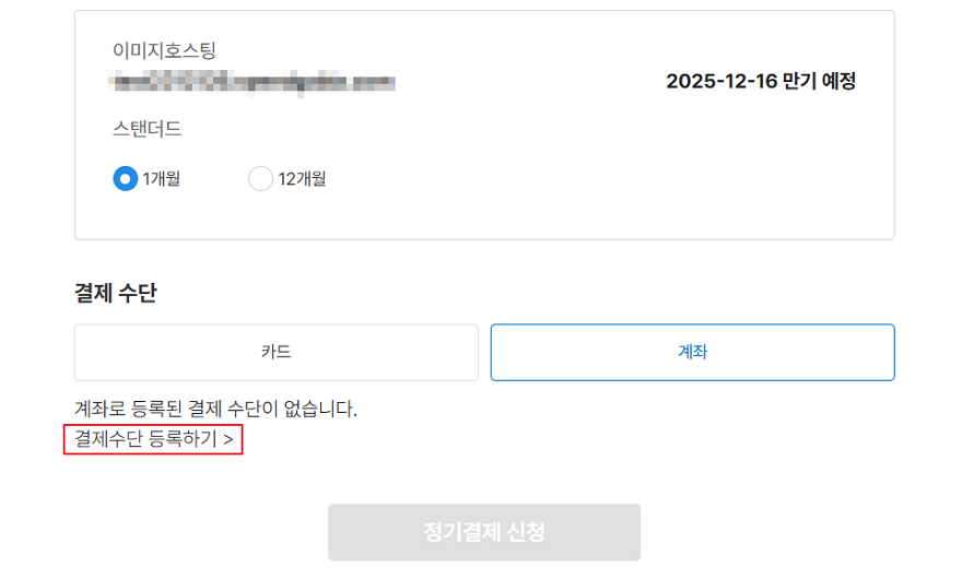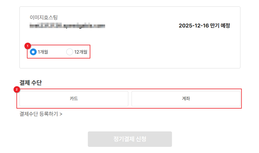 4. 정기결제를 진행할 단위 (1개월 또는12개월)을 선택하고, 등록할 결제수단(카드 또는 계좌)을 선택합니다.