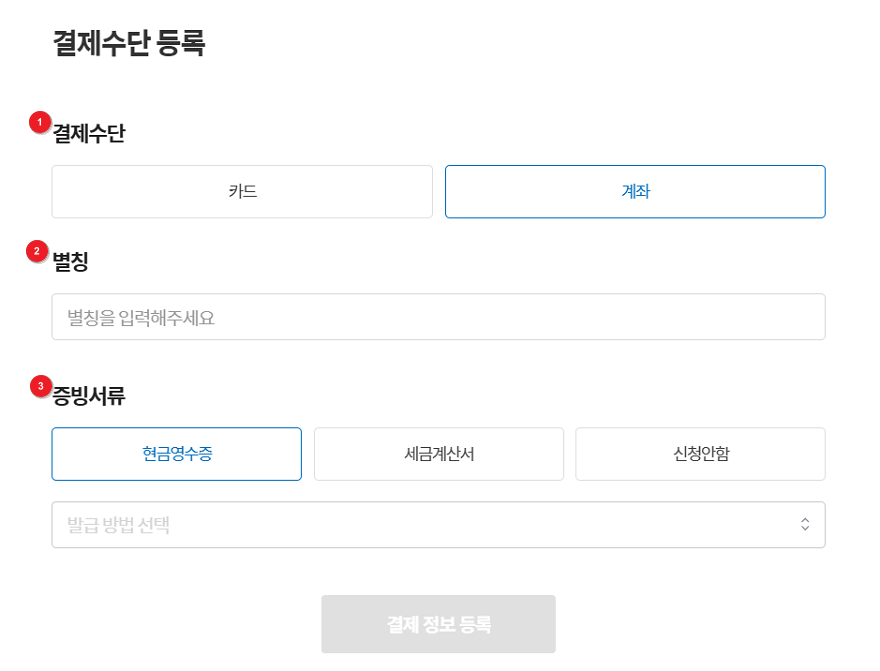 ③ 등록 결제 수단이 계좌인 경우 증빙서류 발행 유무를 선택합니다.